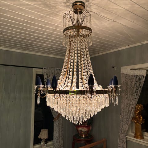 Prismekrone , lengde fra taket ca 80 cm, diameter ca 56 cm
