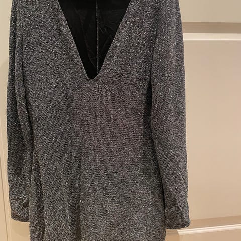 Bomullskjole fra Culture, grå med glitter, str M, rynkedetaljer på ermene, ermene rekker ca til albuen, skjørtet til rett over knærne.