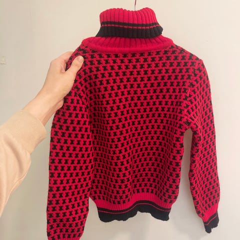 Strikket i Drops Lima ull/alpakka. Det er strikket noen cm ekstra på ermene da de var litt korte. Fargen er blush og svart.