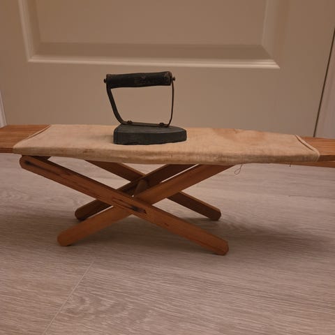 Søtt strykebrett i tre med tilhørende strykejern. Strykebrettet er trukket i et søtt rutete stoff.
