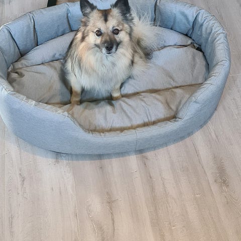Overseas hundeseng kjøpt på Dyrego, str 90x60. Avtagbar pute som kan vaskes.