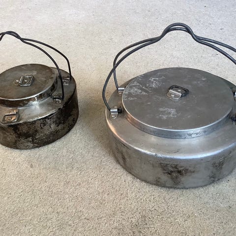 Stabel med tre aluminiums boller som holdes sammen av ei lærreim. Alt originalt, og i god stand.