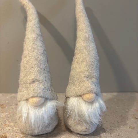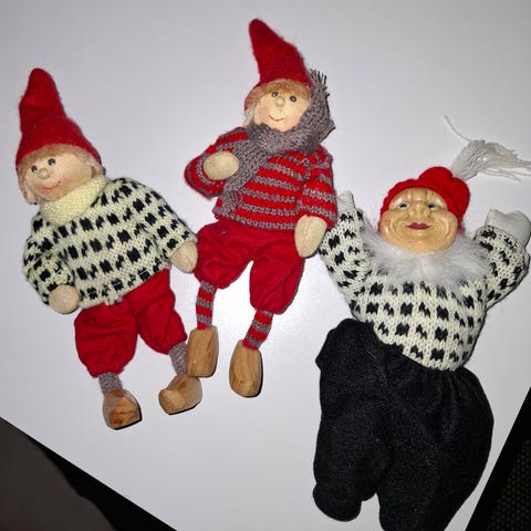 Den andre er med rød lue, «genser» i grått og bukse i sort. Ca.12cm lang.