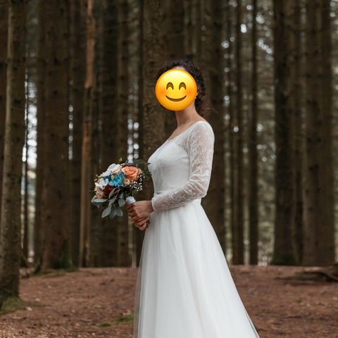A-linje/prinsesse-modell med lange armer i nydelige blonder, og langt slep. Behagelig å ha på seg, kan fint brukes en hel kveld. Passformen er behagelig, men også veldig flatterende.