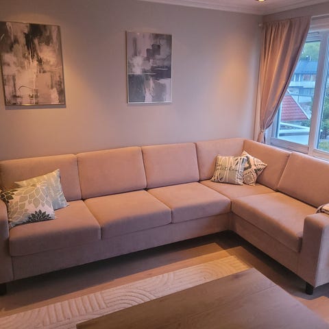 En sofa som er utrolig god å sitte i og som er forholdsvis liten og nett.