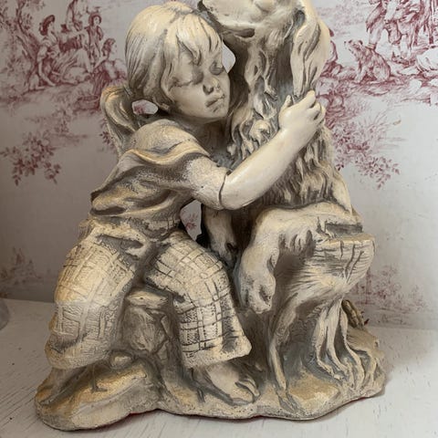Veldig søt figur/skulptur av et barn med en kanin. Jeg tror materialet er bronse, og den er håndlaget i 1982, inskripsjonen sier: "Sculptured treasures inc 1982". Figuren er ca 15 cm høy og i fin stand, bortsett fra