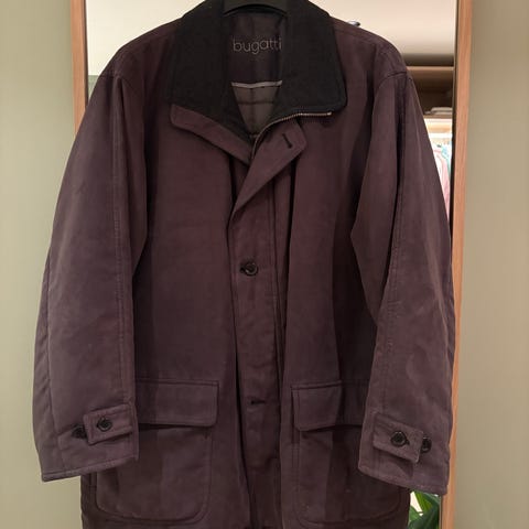 Kjempefin tynn dunjakke fra Bugatti- Pent brukt, har. bare en liten rift ved lommen. Det er bare å sy på baksiden- Vil ikke synes. Ellers i fin stand- Brukt bare et par ganger.Herrejakke.