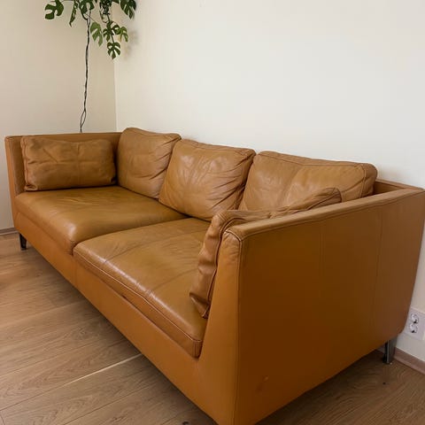 IKEA Modell Stockholm Skinnsofa i lys beige farge. Sofaen er laget av skinn og har plass til minst 3 personer. Den passer godt i en stue eller oppholdsrom og gir et moderne og stilrent uttrykk. Sofaen har en lys farge som kan passe inn i ulike interiørstiler.