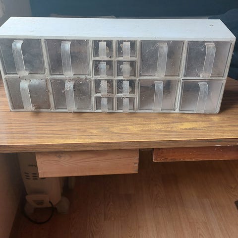Synlige bruksmerker og en av de store runde beholderene med en sprekk. Fullt brukelig uansett. Lokka går fint å skru på plass på alle beholderene.