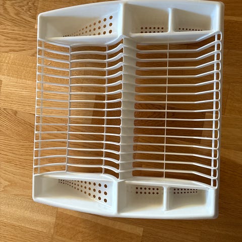 Oppvaskstativ i hvit plast med plass til tallerkener, glass/kopper og bestikk.