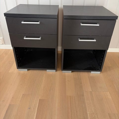 2 stk sorte hyller, brukt som nattbord hengt opp på veggen. Skruer til oppheng medfølger, kan også brukes satt oppå hverandre slik som vist på bilde 2. Ingen bruksmerker eller slitasje, har teipet fast oppheng på på bildene.