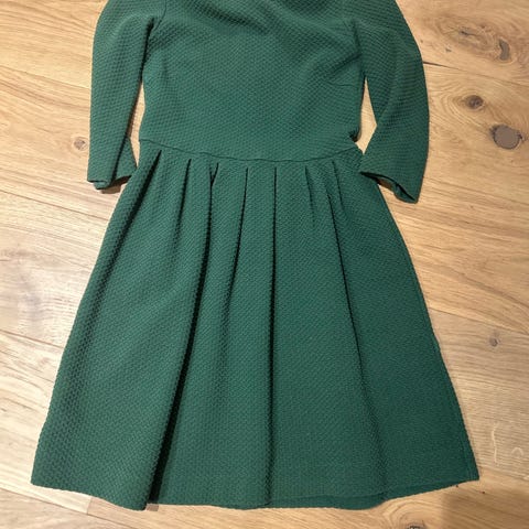 Nydelig, fotsid kjole i 100 % viskose. Lett og luftig. Foret skjørt, men ikke foret i overdel. Stramming i livet gir fin silhuett. Brukt til pent noen få ganger. Beige blomstermønster på mørk blå bunn gjør at den kan brukes både sommer og vinter.