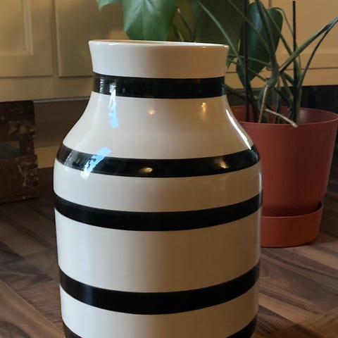 Sort vase 20 cm høy med sorte striper. Fat med sorte striper. Vase brukt et par ganger. Fat er ubrukt, men har allikevel en liten stripe i glasuren. Som litt krakkelert 😅 Ellers pent altså.