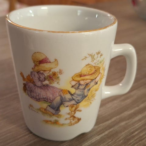 Fin glans. Ingen krakkelering og nag, men litt slitasje på fargene, se bilder. Ståltrykksdekor med pike og kosebamse. Rød rand. Bruksspor.