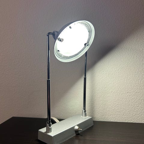 Lite ståspeil med ledlys/ringlight. Kan byttes fra hvitt, gul/varmt og blåhvitt/kaldt.