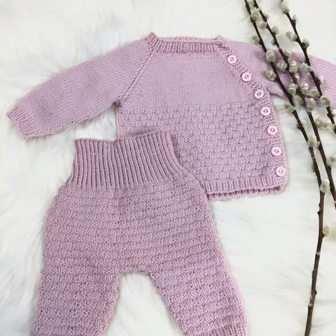 Hvis jeg husker rett så er genseren, de rosa sokkene og shortsen strikket i størrelse 6 til 9 mnd.