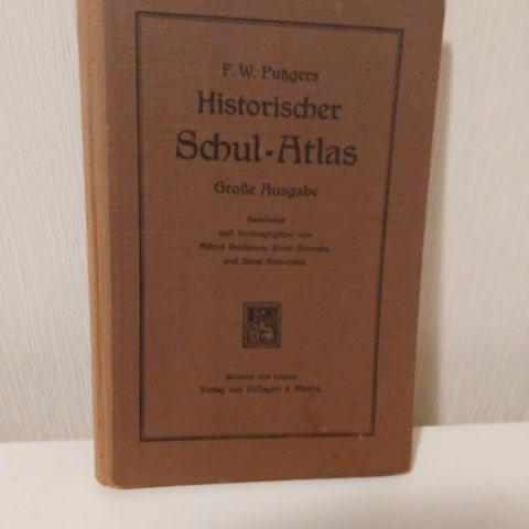 Et skoleatlas fra 1935 på tysk, "Historischer Schulatlas" som har blitt brukt på Sandane gymnas før 2. verdenskrig. Atlaset er rikt illustrert med fargede kart.