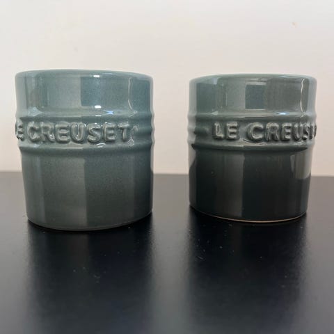 Vase og telysestaker i fargen Ocean i Le Creuset selges samlet for 500,-