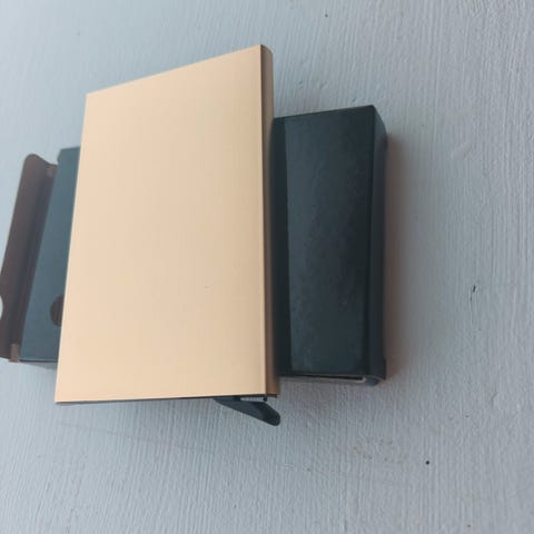 Lommeboken har en Pop-up funksjon som gjør at det er en knapp nederst på lommeboken og når den trykkes skyves kortene opp.