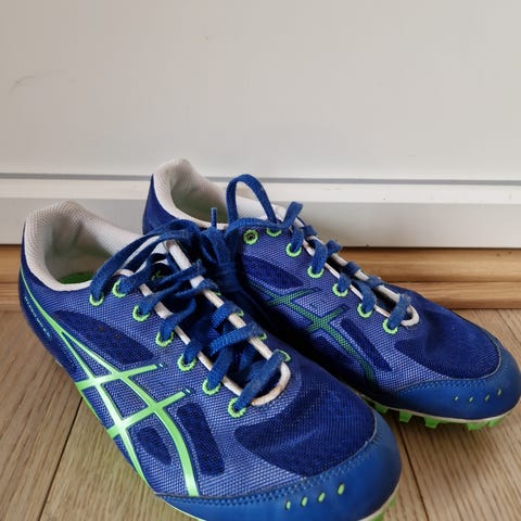 Brukte piggsko selges. Brukt under litt løping og lengde i friidrett. Mye bruk igjen av skoa, kun bokstavtrykk i skoa som er slitt.