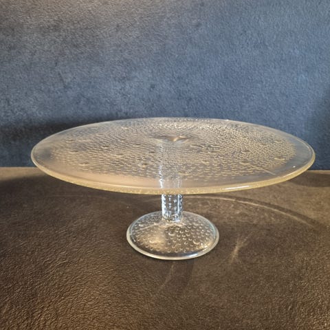 Selger lite brukt liten kakefat i glass for 40 kr.