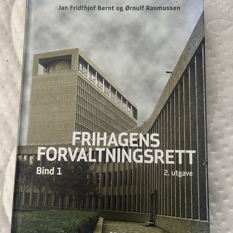Frihagens Forvaltningsrett Bind 1 bok. Inneholder informasjon om forvaltningsrettens prinsipper og praksis.