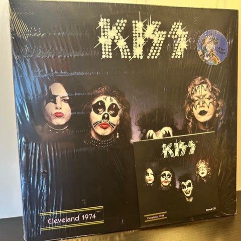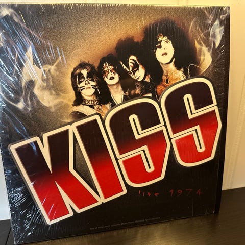 Uåpnet mini gitarkasse med Kiss, The Definitive Kiss Collection. Er noen skader på plasten utenpå. Disse ligger høyt i pris på Discogs og på Ebay når de er uåpnet.