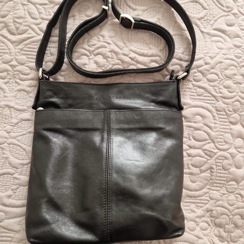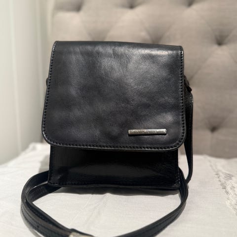 Selger en skulderveske i ekte skinn fra det anerkjente merket The Point. Vesken er håndlaget med italiensk design og har en flott brun farge. Den har en praktisk glidelåslomme foran, messingdetaljer og et justerbart skulderbånd. Vesken er i god stand med normal bruksslitasje som gir den en fin vintage-look. Perfekt for hverdagsbruk eller som en stilig detalj til antrekket.