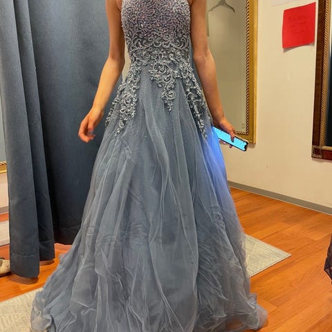 Nydelig ballkjole brukt kun 1 gang og renset etter bruk. Passer str xs-m pga regulering bak med snøring og flyttbar stropp. Champagnefarget med små «diamanter»