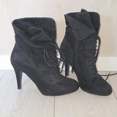 Åpne høye hæler med snøring og glidelås på innersiden.