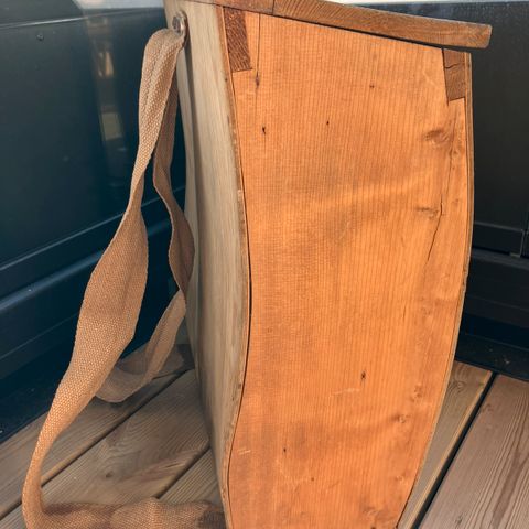 «Ryggsekk / rygg-kiste», laget i finèr med noe fingerskjøting men hovedsakelig stifter. Spenner / stifter er noe rustet. Lærremmene bør potensielt byttes da den ene er løs i hempe oppe på høyre side. I forhold til hvordan ryggpartiet er buet, ble nok denne laget til en lang person. Jeg har ikke forutsetning for å kunne tidfeste når denne ble laget, men den bærer noe preg av å ha vært i bruk.