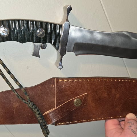 Selger en dobbelt hodet viking øks. Øksen er laget av stål N1095 og skaftet er laget av rosetre fra India som er kjent for sin kvalitet og styrke. Øksen er unik og har to forskjellige graverte norrøne symboler på øksehode se bilder. Øksen har en lengde på 72 cm hodet er 26x15 cm og vekten er 2 kg.Ekte kuskinn ved nedre del av skaftet. Utstyr som følger med er oppheng til vegg for øksen som er laget av drivved. Skinn beskyttelse for øksehodene med hank for belte. Passende kniv følger også med. Total vekten er 4,5 kg.