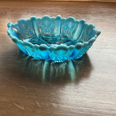 En vintage glasskål fra Davidson Glass, England, i klart blått glass.