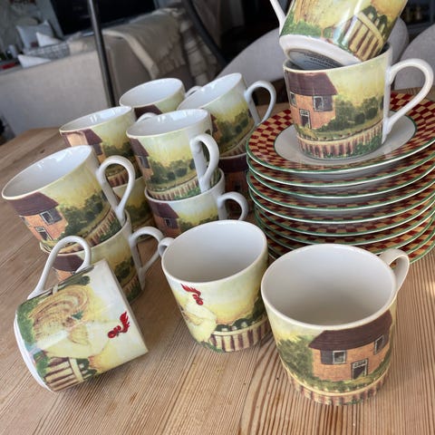 Tilstand . Koppene & fatene er pent og lite brukt. Ingen bruksmerker. Selges sammen kopp & fat. til kr 210 pr kuvert.Pris for begge kuverer kr 395