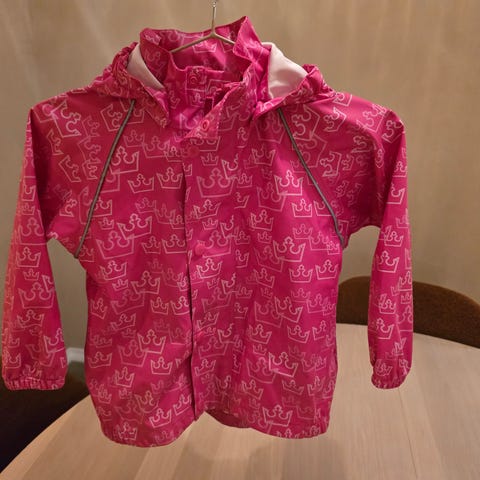 Selger en pent brukt regnjakke str. 6 år. Rosa med kroner.