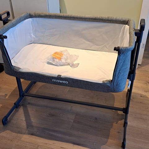 Bedside crib Fillikid. Nesten ubrukt. Laken kan fåes med. Ny pris 1683 kr. Festes med medfølgende stropper i sengen den skal stå ved siden av. Ene siden kan brettes ned.