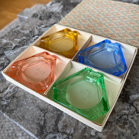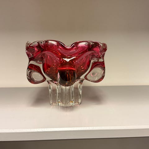 Nydelig stort askebeger i glass med rød farge. Askebeger har diameter på 14 cm. Askebeger i meget god stand er tidstypisk for 50-60 tallet.