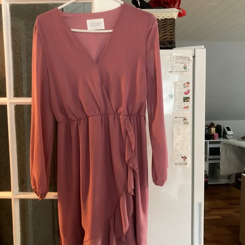 Sister Point festkjole i størrelse M, farge rød. Kjolen har lange ermer og en knytebelte i midjen, som gir en elegant passform. Passer til formelle anledninger og festlige sammenkomster.