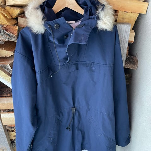 Klassisk fjellanorakk, Udis, str. 52. Marineblå. Fast hette med snøring. Stor brystlomme med glidelås. Snøring nederst. Strikket mansjett på ermene.