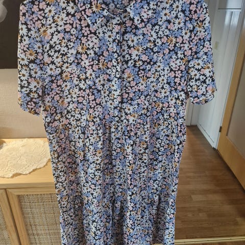 Denne nydelige kjolen har et delikat blomstermønster i flere farger, inkludert hvit, rosa, gul og svart. Den har knapper foran og en knytefunksjon i livet som gir en flott passform. Kjolen er perfekt til både hverdagsbruk og spesielle anledninger, og gir et feminint og stilfullt uttrykk.