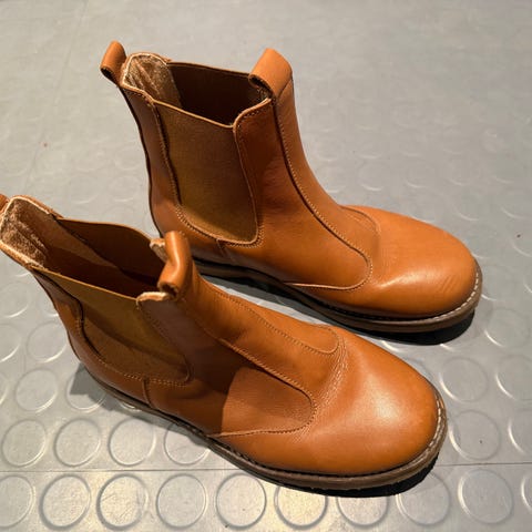 Verdens fineste vintersko til barn? Fra Barcelona-baserte Tiny Cottons. Brukt en gang. Foret. Ser ut som ull. Skinn utvendig, og såle i rågummi. Trenger ny innvendig såle, da de er brukt til andre sko. Koster 60,- for såle på nett.