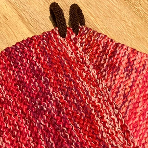 Tykke, gode grytekluter strikket i femdobbelt bomullsgarn i rødtfarger. Den brune ringen til oppheng er også strikket, og strikket fast til gryteklutene. De måler 18 x 19 cm. Vekt 174 gram, så her går det med mye garn. Om du tenker at dette er dyrt vil jeg forsvare prisen med garnmengden og at dette er fryktelig tungt for armer og hender å strikke og blir veldig gode grytekluter.