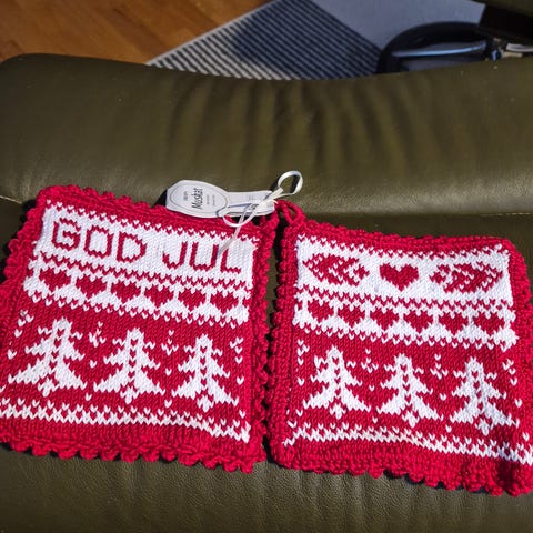 Om du tenker at dette er veldig dyrt vil jeg forsvare det med at det garnmengden og at det er fryktelig tungt for armer og hender å strikke, det tar tid - og dessuten blir det veldig gode grytekluter.