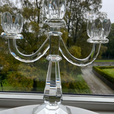 Nydelig krystall lysestake. Både kubbelys og store telys passer., Høyde ca 21 cm