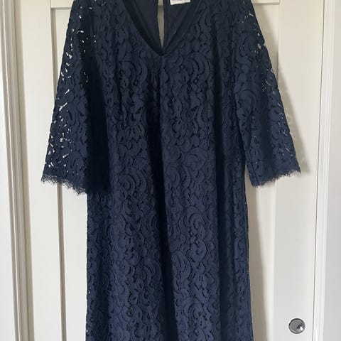 Pent brukt penkjole fra Holly&whyte (Lindex) selges for 250,- Brukt 3-4 ganger i barnedåp, til jul og nyttår. "Brokade" blonder. Mørk blå (nærbildene av kjolen viser feil farge) Noen nupper etter bruk, se bilder, men disse kan sikkert fjernes enkelt. Superfin og "nett" passform, formsydd etter bryst og går lett ut i underdel. Dette synes ikke godt nok på bilder, men har forsøkt å ta bilder av sømmene rundt brystpqrti. Veldig behagelig å ha på. Selges fordi den er blitt for stor ;)