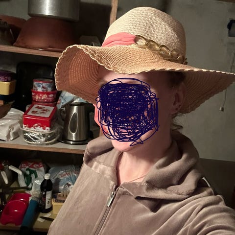 Mørk brun, fjong hatt. Det står ikke størrelse, men vil tro ca str 57-58