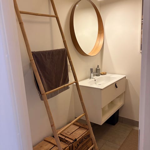 Stigen er frittstående og ufestet slik at du enkelt kan lene den mot en vegg og henge håndklær på trinnene for å tørke dem og holde dem i nærheten. Stigen er laget av bambus .