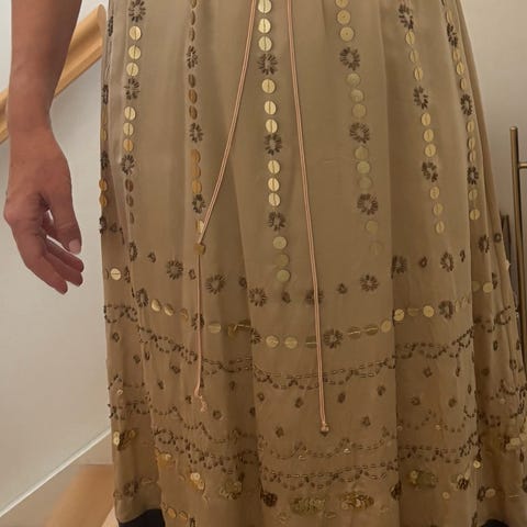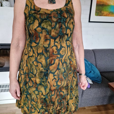 Lite brukt kjole i ullblanding. Svart med gulldetaljer, svart underskjørt. Str XL, men er sydd om for å passe S/M.