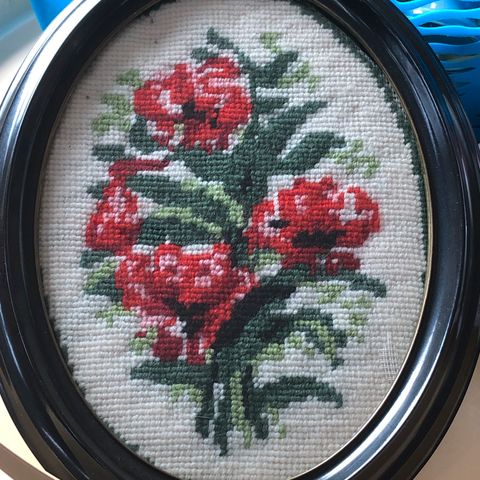 Selger to broderte bilder i ramme samlet. Høyde 21 cm