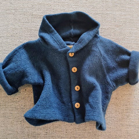 Selger en hettejakke fra Nøstebarn i ullfleece/børstet ull, som bare har blitt prøvd på.